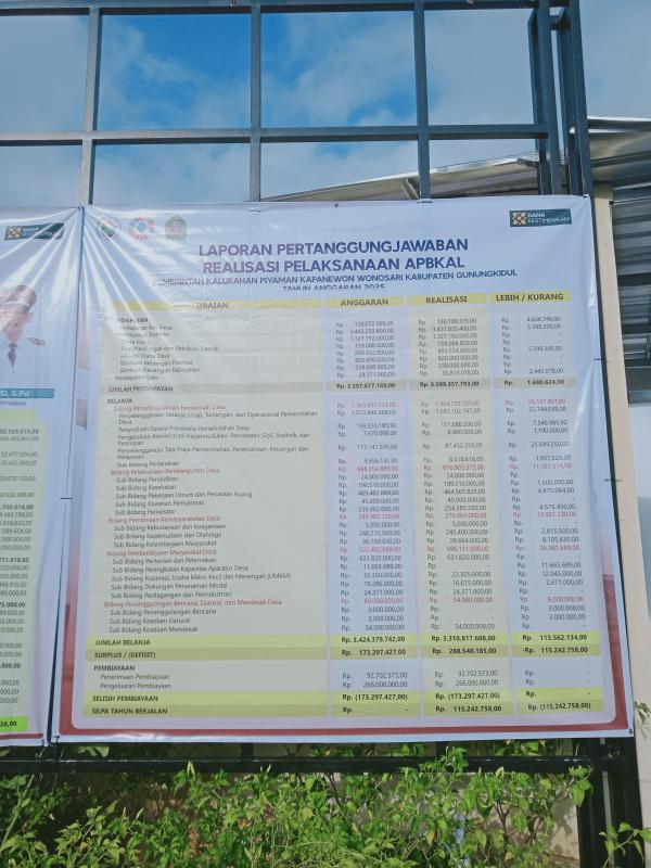 Peraturan Kalurahan Piyaman tentang Laporan Pertanggungjawaban Realisasi Pelaksanaan Anggaran Pendapatan dan Belanja Kalurahan (LPJ APBKal)  Tahun 2025 telah di tetapkan pada tanggal 29 Januari 2026 setelah melalui pembahasan dan  persetujuan bersama antara Bamuskal Kalurahan Piyaman  dan Lurah Piyaman. Perkal tentang LPJ Realisasi Pelaksanaan APBKAl Tahun 2025 ini merupakan Laporan pertanggungjawaban pelaksanaan kegiatan APBKal Tahun Anggaran 2025.